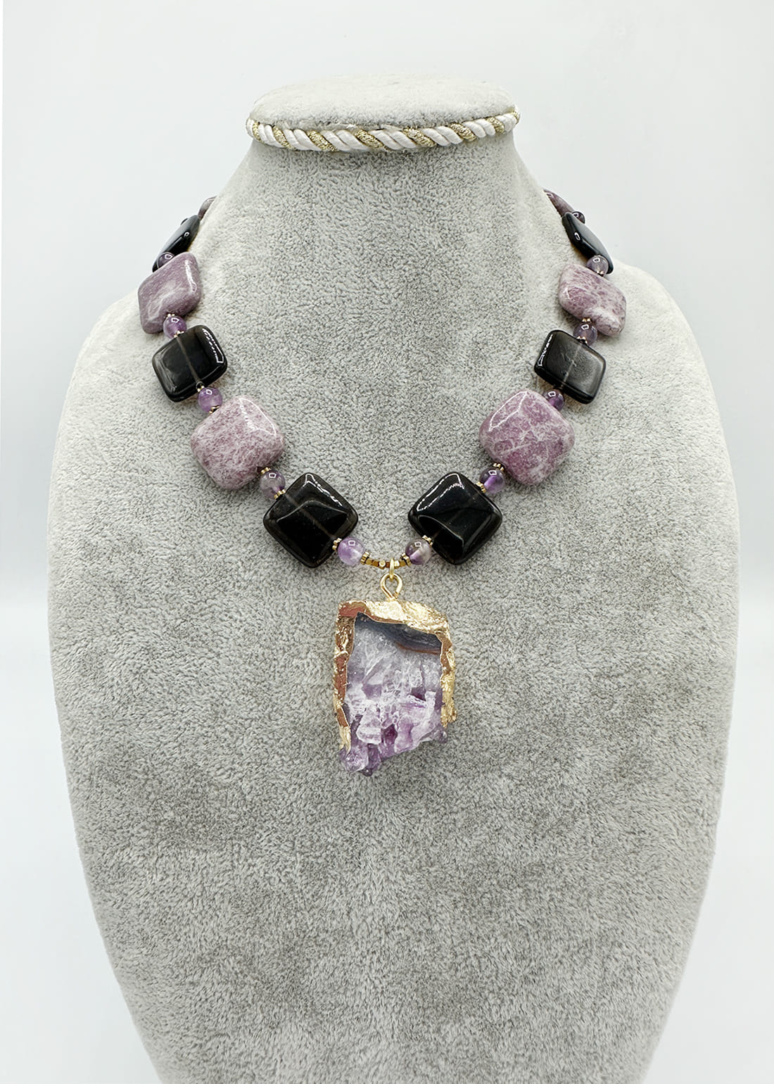 Collar de cuarzos ahumados, lepidolitas, amatistas, hematites y colgante de drusa de amatista.