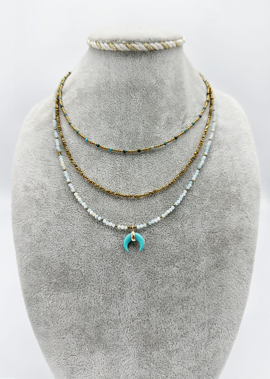 Este collar no solo es un accesorio de moda, sino también un amuleto cargado de energía positiva. El hematite dorado es reconocido por su capacidad de atraer estabilidad y confianza. La turquesa es una piedra protectora que promueve la paz y la comunicación, mientras que la amazonita equilibra las emociones y fomenta la claridad mental. Finalmente, el colgante en forma de luna o cuerno de turquesa evoca la conexión con la intuición y la fortaleza personal, convirtiendo este collar en un símbolo de empoderamiento y bienestar.