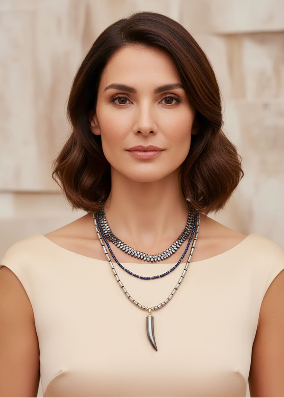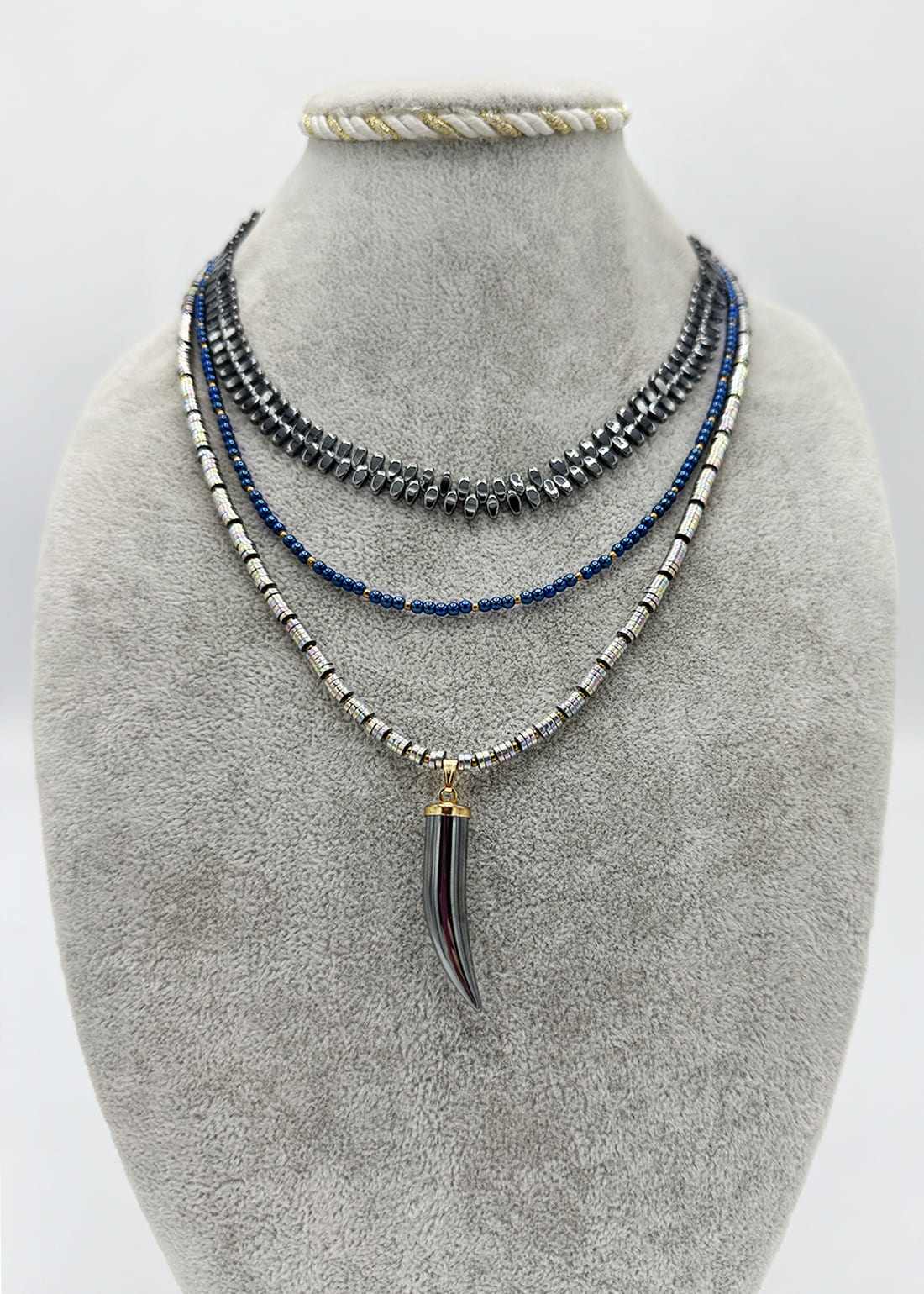 El alucinante collar triple con colgante de cuerno de hematite es una joya que fusiona la fuerza y el magnetismo de los minerales con un diseño exclusivo y sofisticado. Su composición de hematites plateados oscuros, hematites azules, hematites dorados y hematites plateados claros iridiscentes crea un juego de reflejos y tonalidades que realza cualquier atuendo con un toque de lujo y modernidad. Su colgante en forma de cuerno de hematite no solo aporta un detalle llamativo, sino que simboliza protección y poder personal.