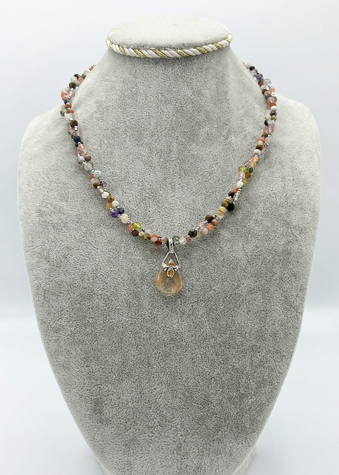 En el centro, un colgante de plata con cuarzo rutilado dorado y una gema de citrino conforman el corazón de la pieza: una fusión de luz y calidez que define su carácter áureo.