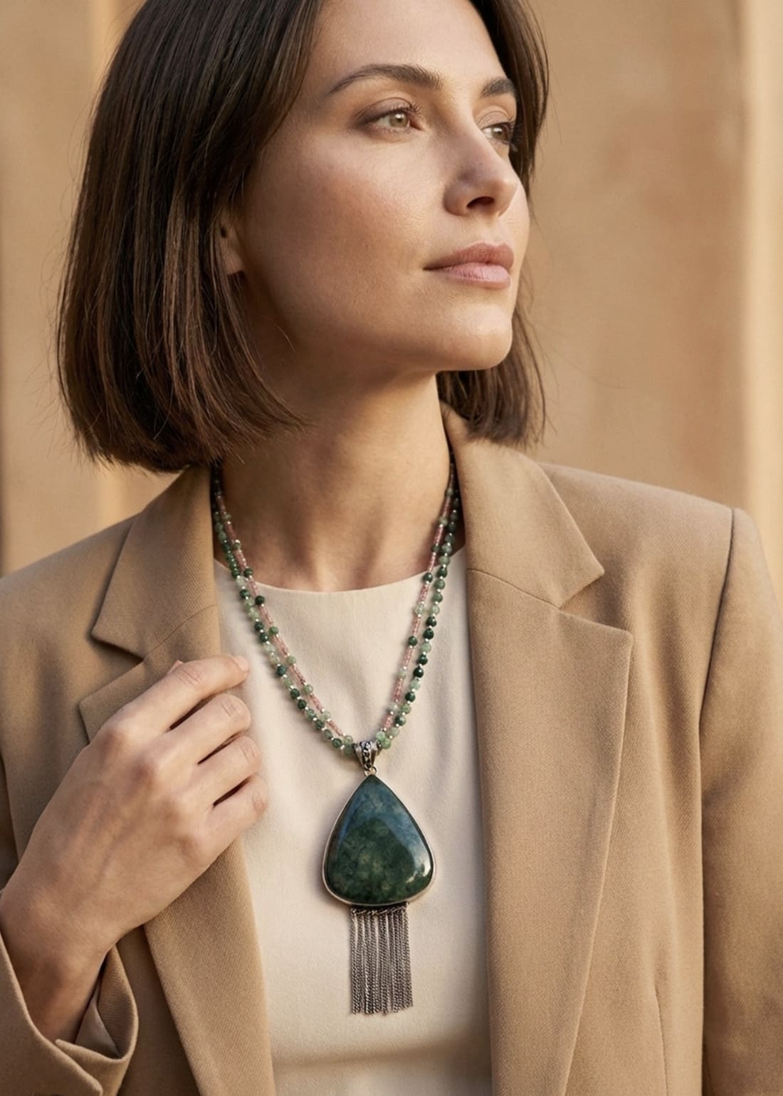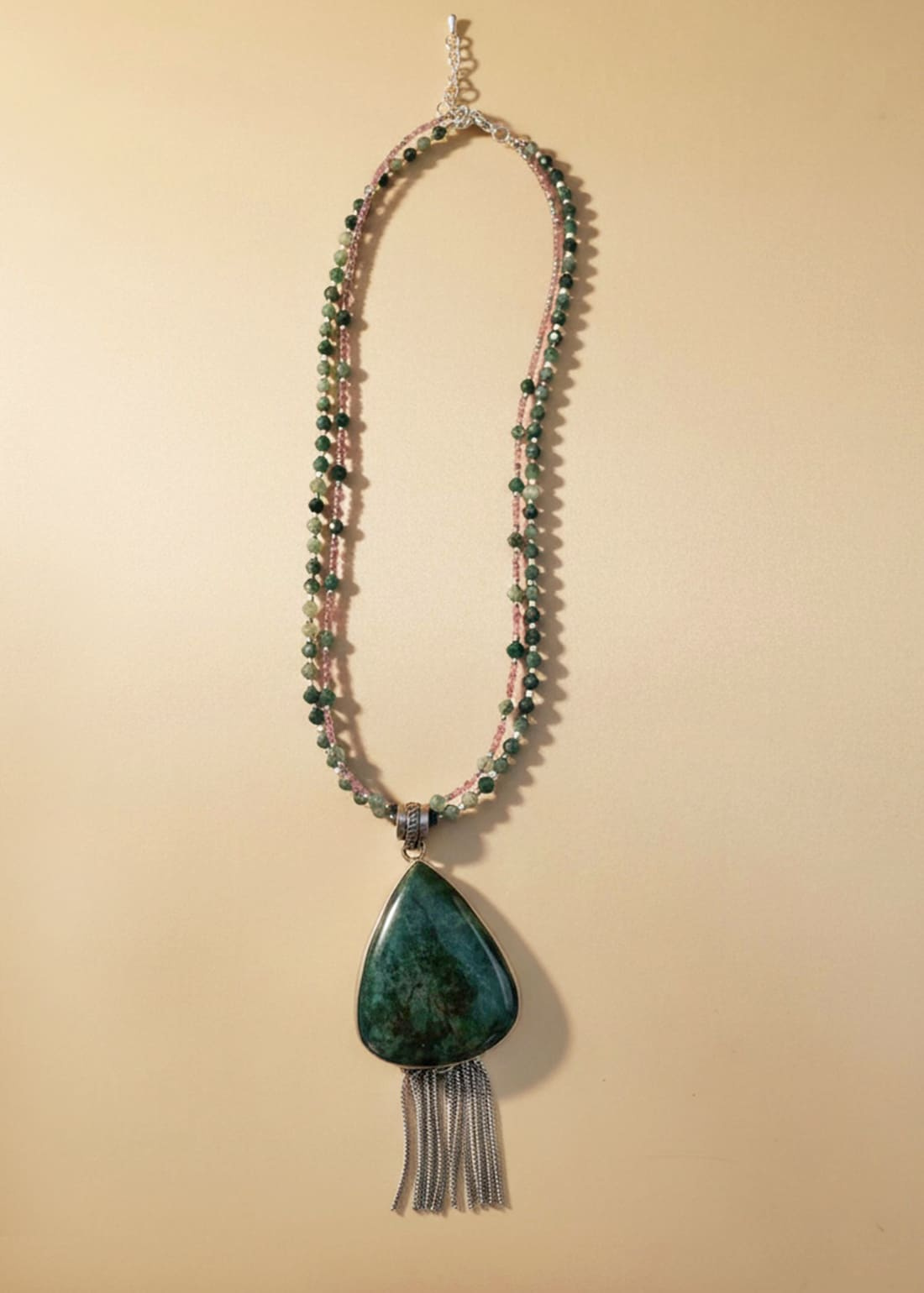 Cada piedra ha sido seleccionada manualmente para construir un ritmo cromático equilibrado: verdes profundos, rosados empolvados y destellos plateados que aportan estructura y luz. El resultado es un collar doble que funciona como pieza central del estilismo, tanto en looks minimalistas como en combinaciones más cálidas y elevadas.