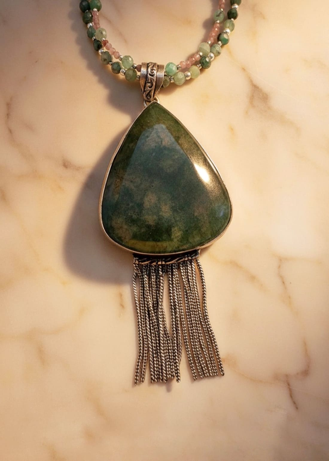 Materiales: colgante de ágata musgosa engastada en plata de ley. Doble collar de turmalinas rosas, raíz de esmeralda y hematites plateados.